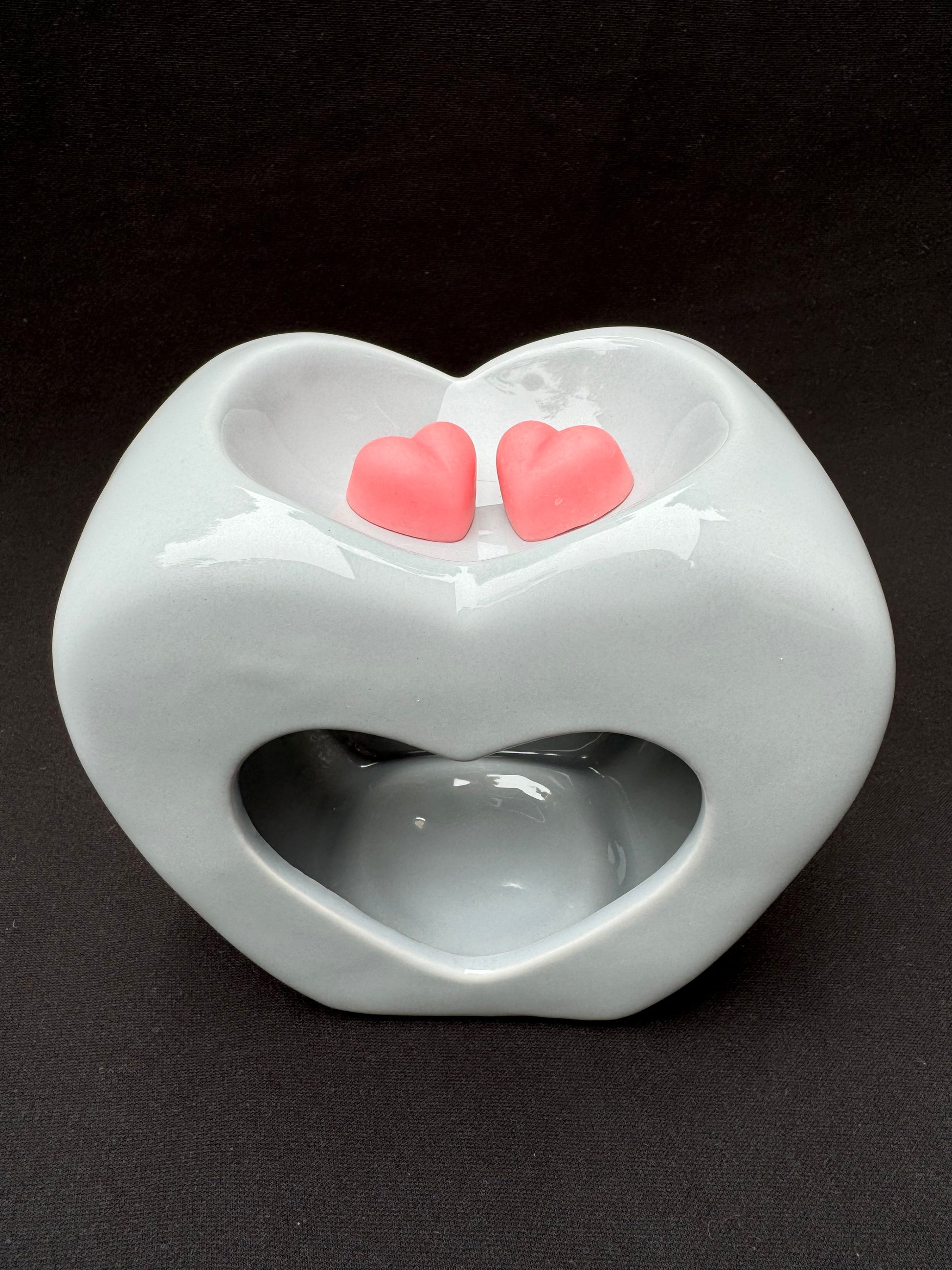The top dish is designed to hold wax melts, and there is a cutout heart in the center, creating a window to view the tea light candle placed below.