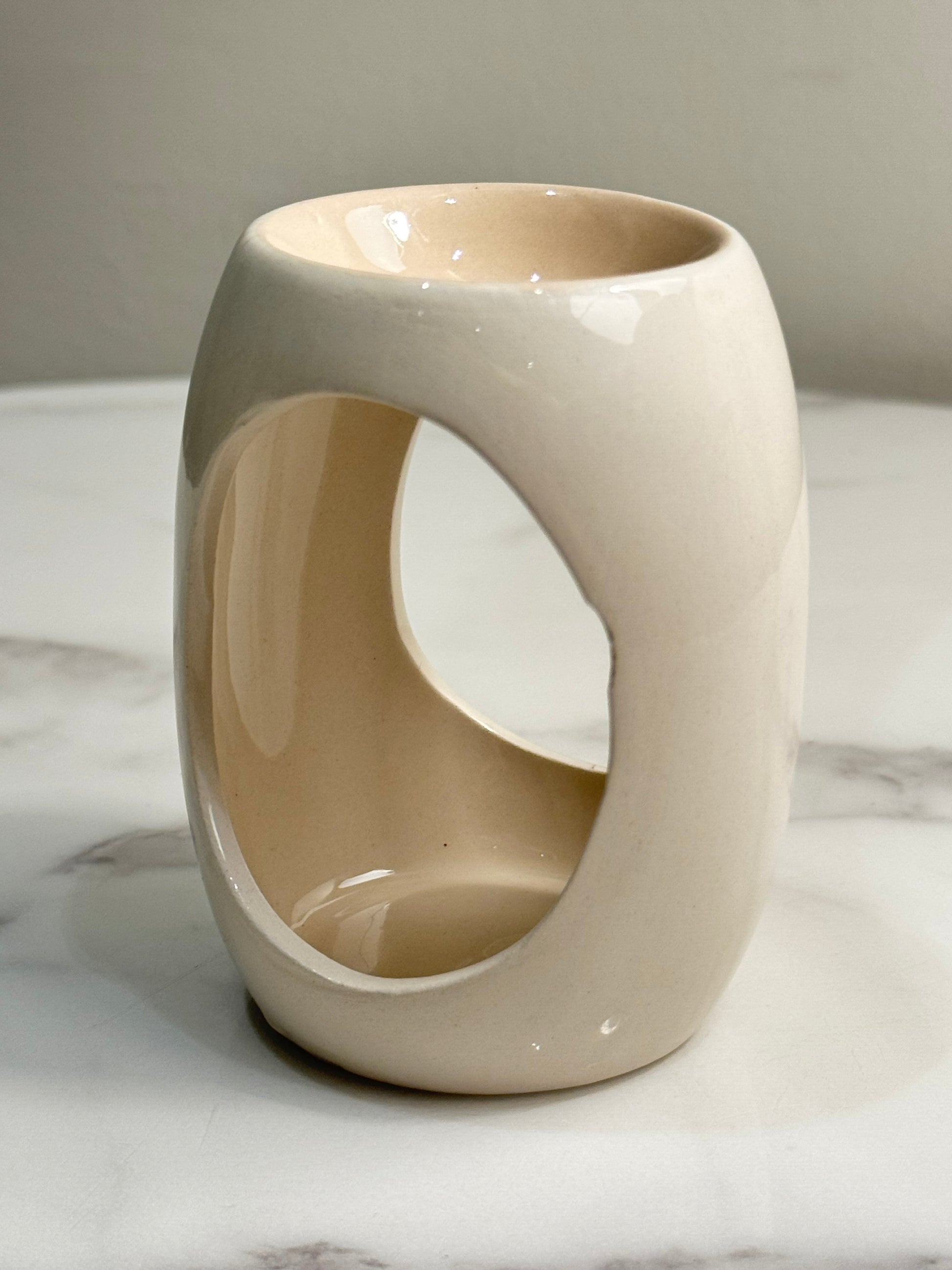 A slightly imperfect wax melt burner with a small chip in the ceramic of the opening of the burner. It does not affect the products use.