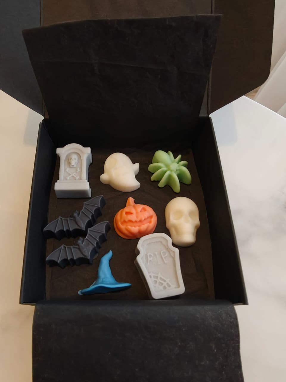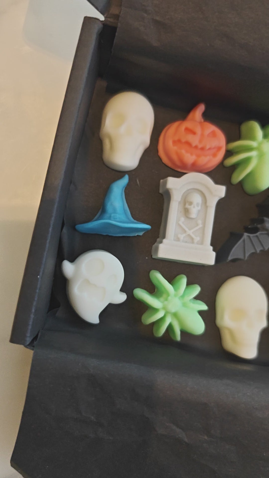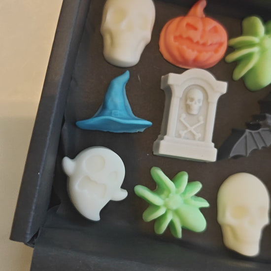 Light up your Halloween with a little spooky shimmer! Each box is filled with a haunting mix of Halloween shapes - skulls, pumpkins, ghosts, bats, witches’ hats, tombstones, and spiders - all dusted with sparkly mica that glimmers beautifully as they melt.